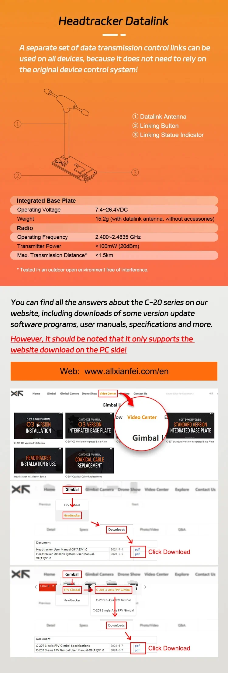The headtracker supports PPM output and UART output.It is possible to remotely control the gimbal and aircraft through RC link or datalink.