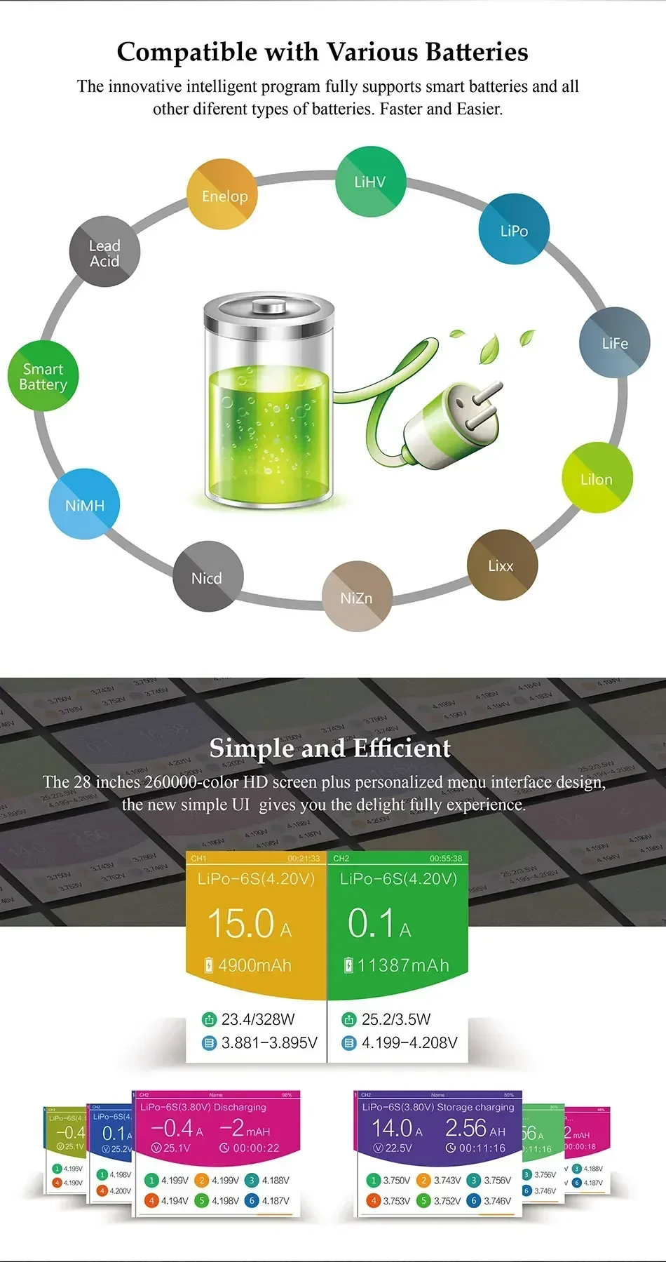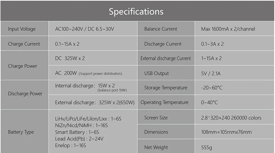 Compatible with Various Batteries - The innovative intelligent program fully supports LiHv/LiPo/LiFe/LiIon/Lixx (1~6S)NiZn/Nicd/NiMH(1~16S)Smart Battery (1~6S)Lead Acid(Pb)(2~24V) Enelop(1~16S)