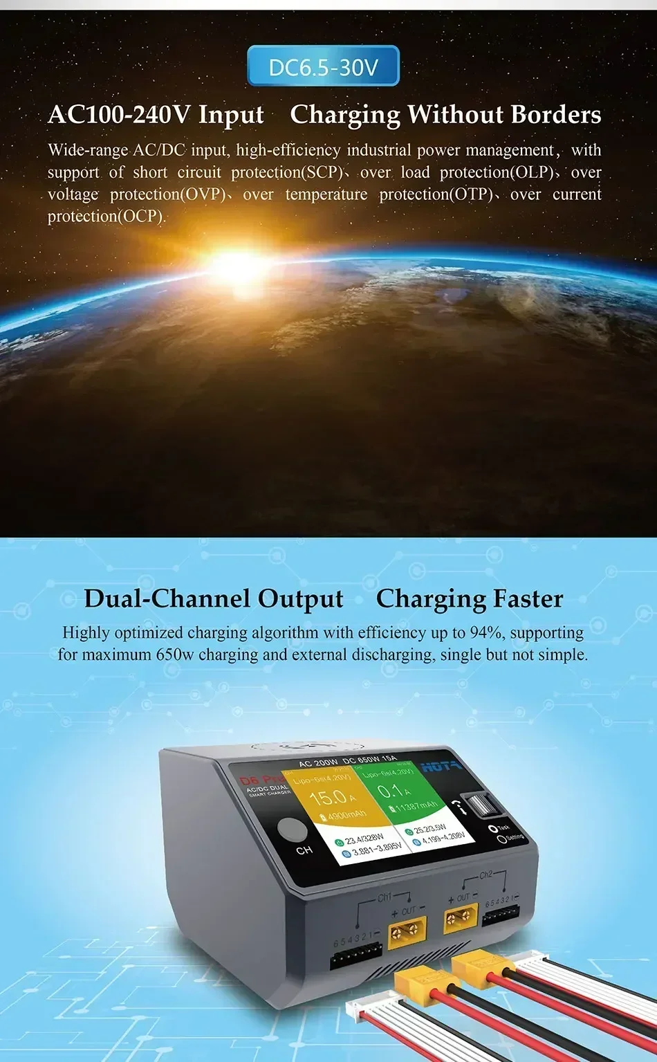 Dual Channel Output, Charging Faster - Highly optimized charging algorithm with efficiency up to 94%, supporting for max. 650W charging and external discharging, single but not simple.