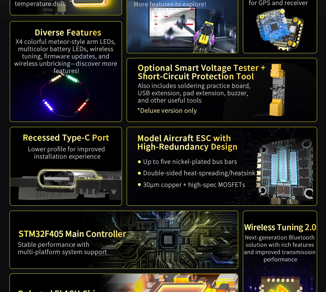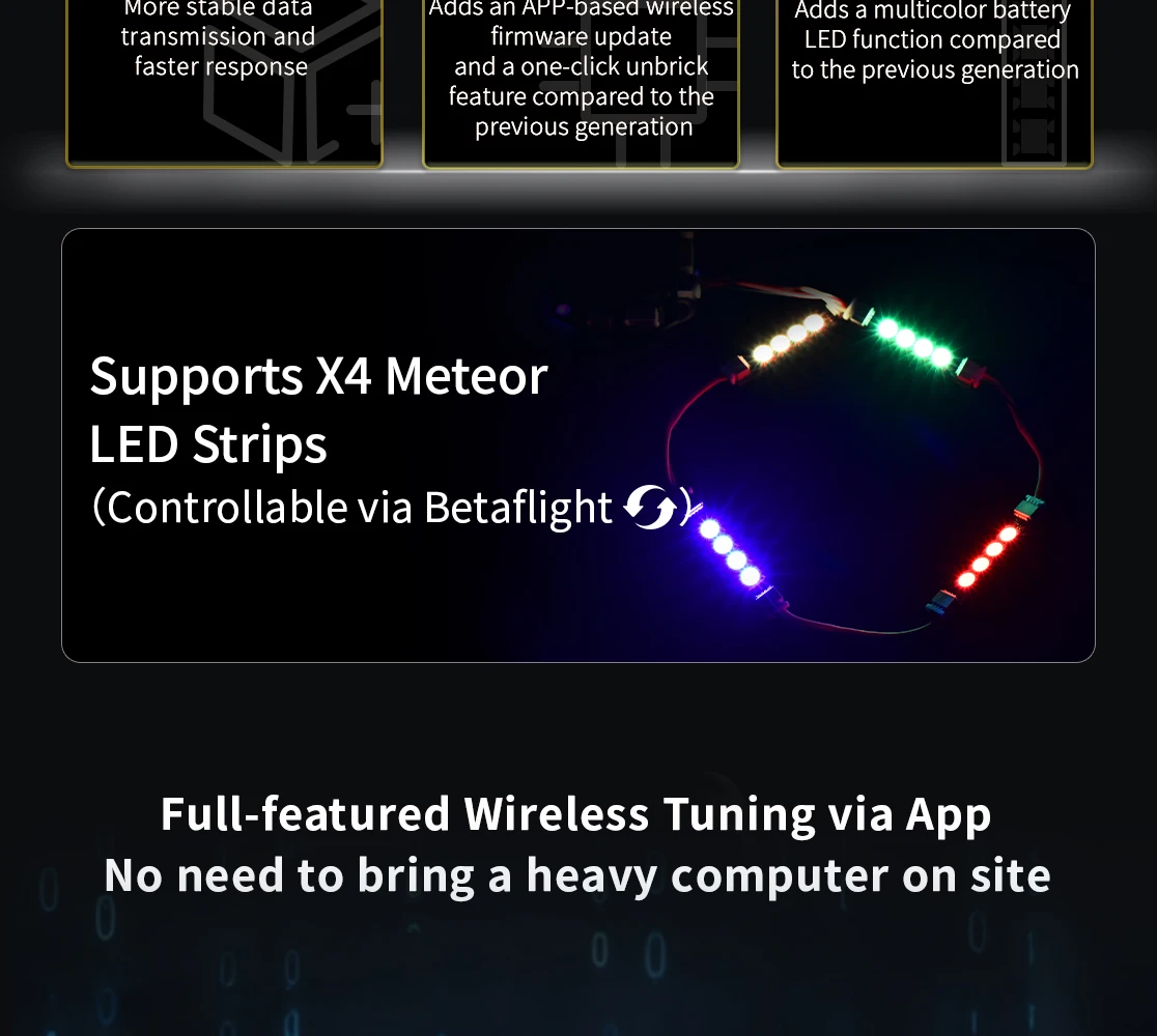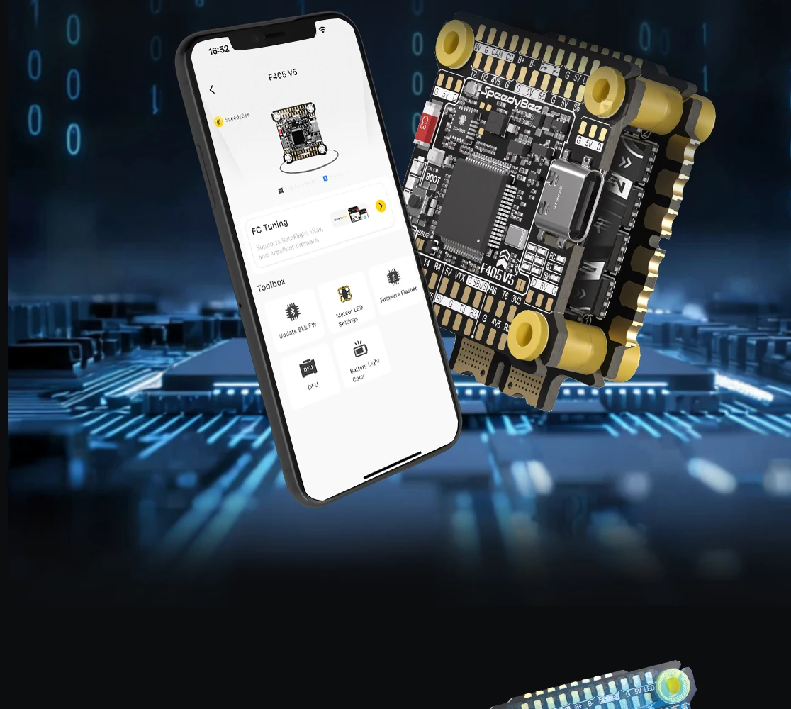 Supported. Connect via SpeedyBee App for FC firmware flashing and parameter tuning. |