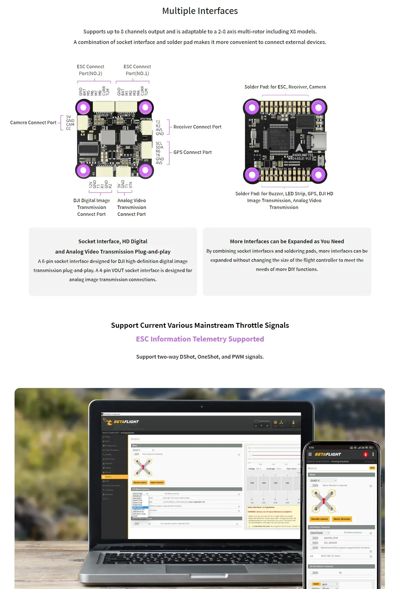Multiple Interfaces: Supports up to 8 channels output and is adaptable to a 2-8 axis multi-rotor including X8 models.