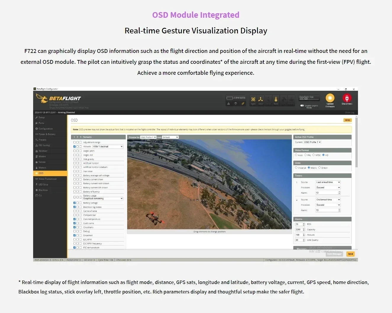 OSD Module Integrated: F722 can graphically display OSD information such as the flight direction and position of the aircraft in real-time without the need for an external OSD module.