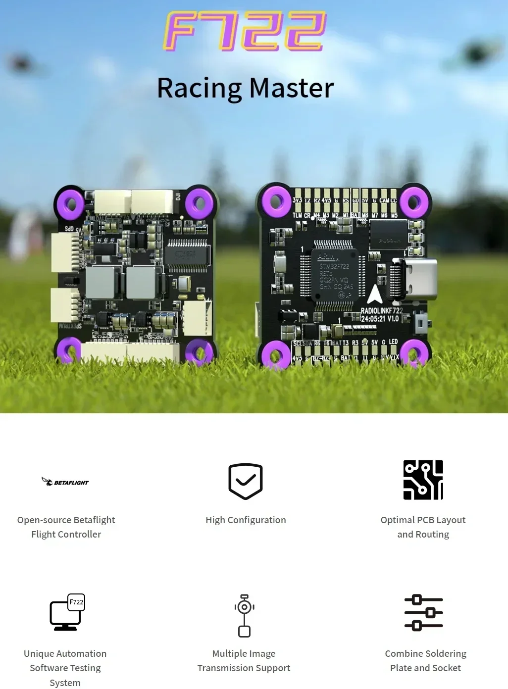 Unique Automation Software Testing System: With the independent research and development of multiple unique flight control systems, we have designed a full-featured automation software testing system from sensor to connection ports and interface. The test efficiency and quality assurance are far superior to traditional manual tests, ensuring the quality of every function of every F722.