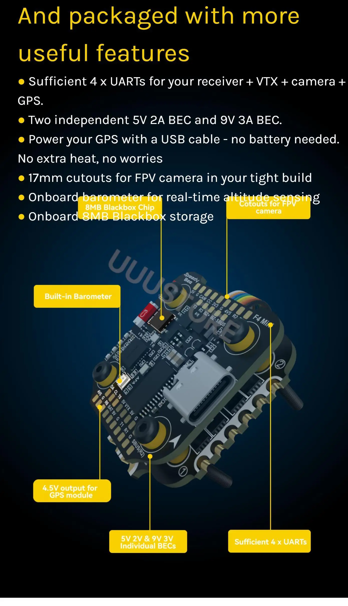 Supported. Designed for radio receiver and GPS module even when the FC is powered through the USB port. Up to 1A current load. |