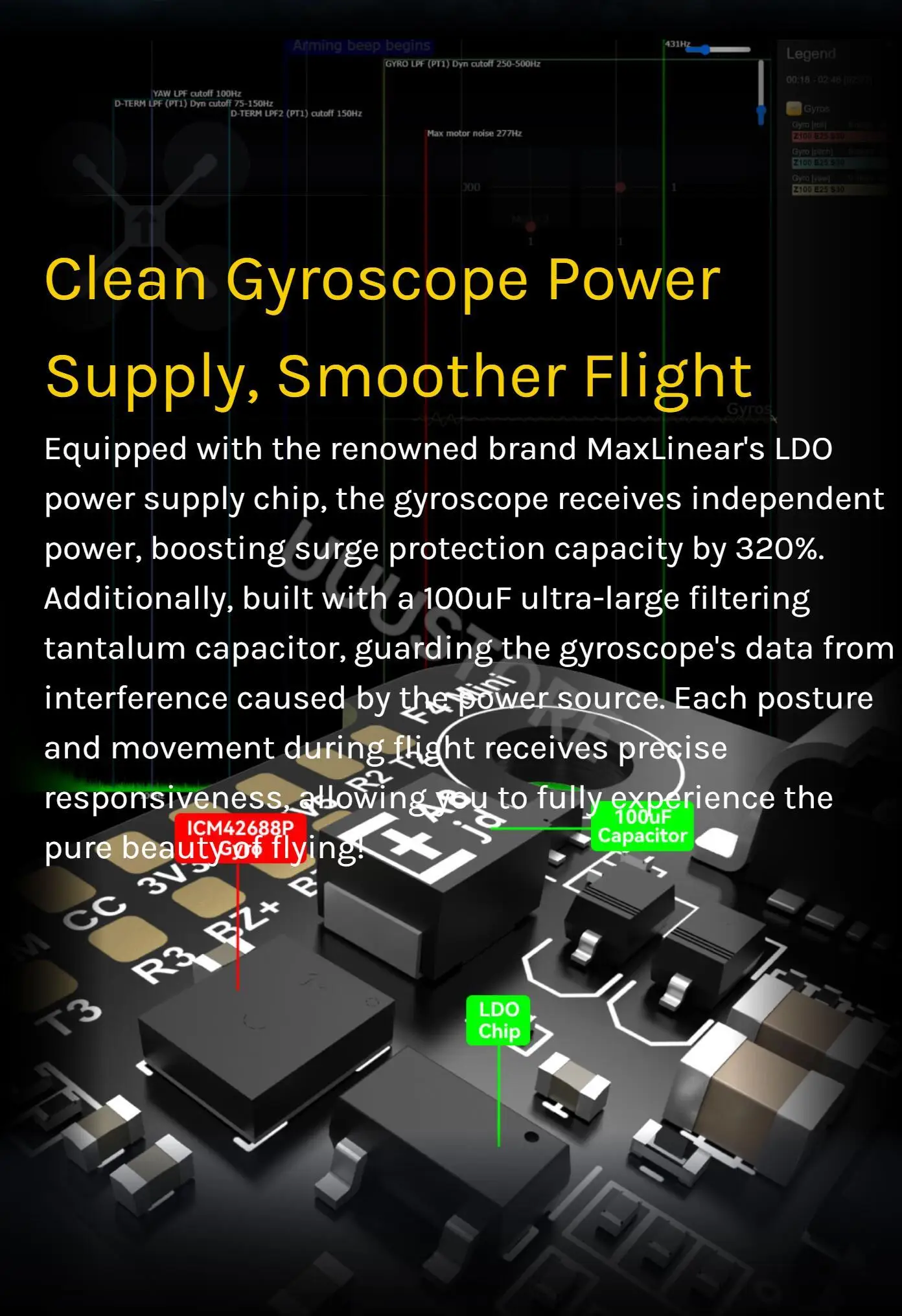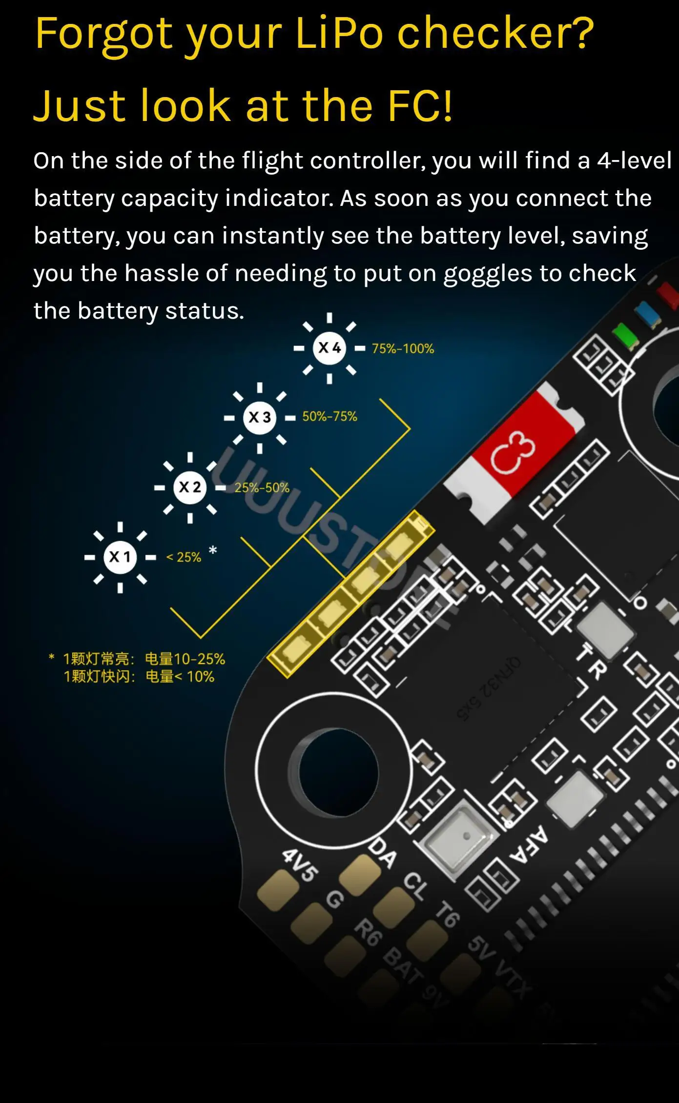 3-6S LiPo. The flight controller is powered through the G, V wires of the 8pin harness or G, V pads from the bottom side of the flight controller. |