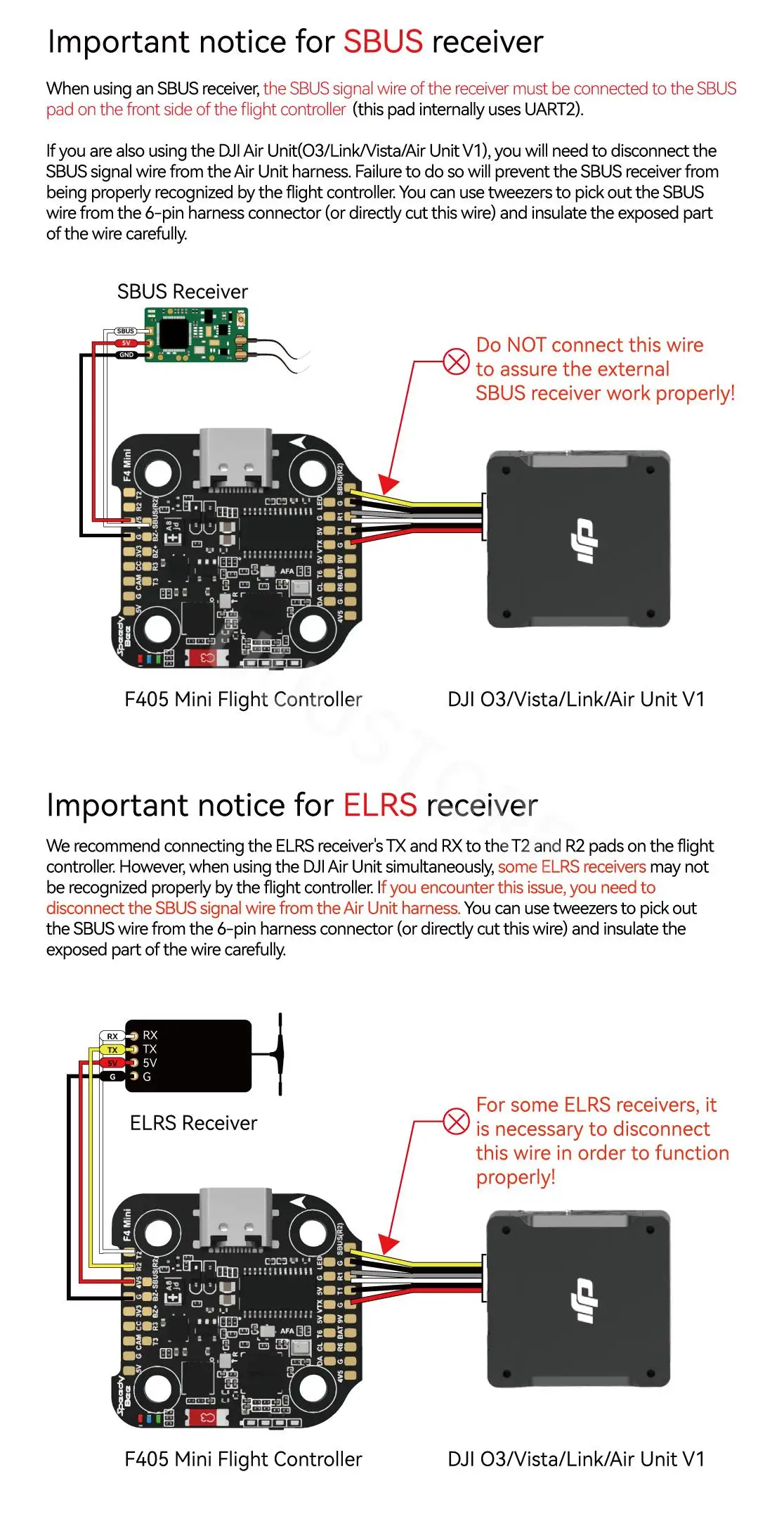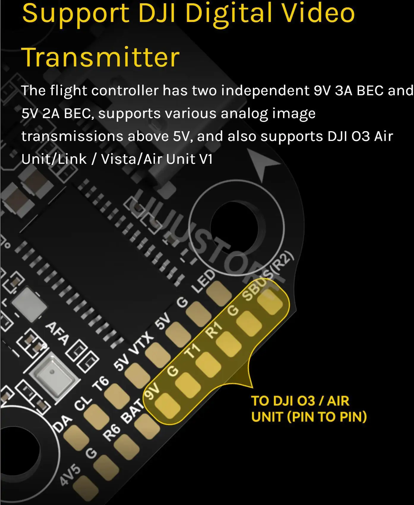 Compatible with all DJI Air Units: DJI O3/RunCam Link/Caddx Vista/DJI Air Unit V1. Please use the solder pads <9V, G, T1, R1, G, SUBS(R2)> on the front right corner of the flight controller to make a pin-to-pin connection with the solder pads on the DJI Air Unit.UART1(T1, R1) is used for OSDand SUBS(R2) is used for DJI Air Unit’s internalSBUS receiver signal input. |