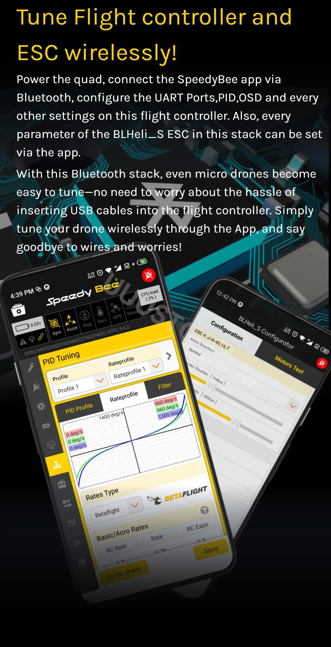 Supported. Used to connect with the SpeedyBee App for flight controller and ESC parameter configuration.Please make sure the MSP switch on UART 4 is turned on and set to a baud rate of 115200, otherwise Bluetooth functionality will not be available. |