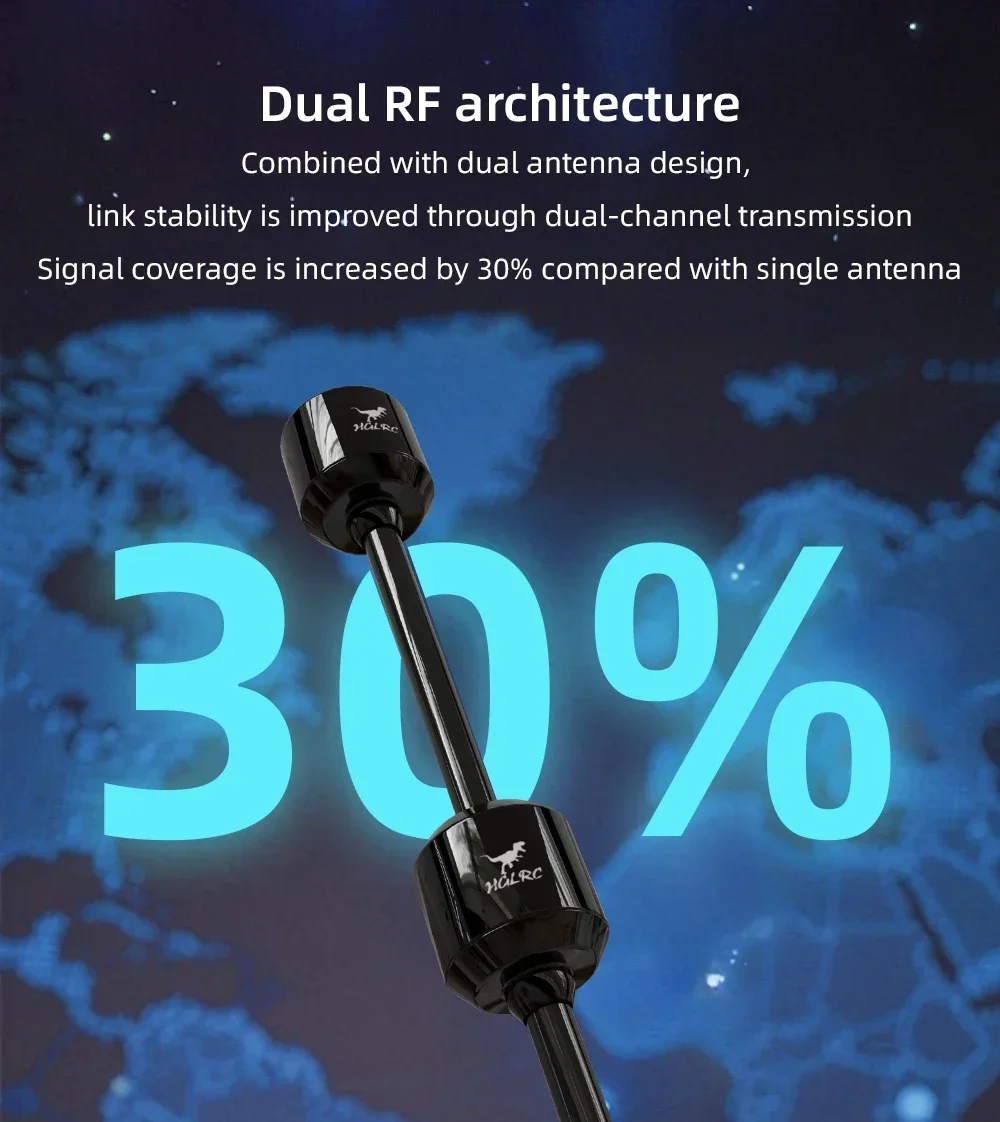 ‌Dual RF Architecture‌: Combines dual-antenna design with dual-channel transmission to enhance link stability, improving signal coverage by 30% compared to single-antenna systems.