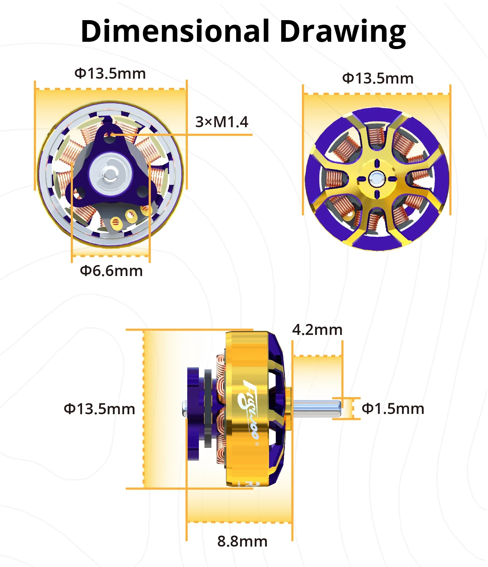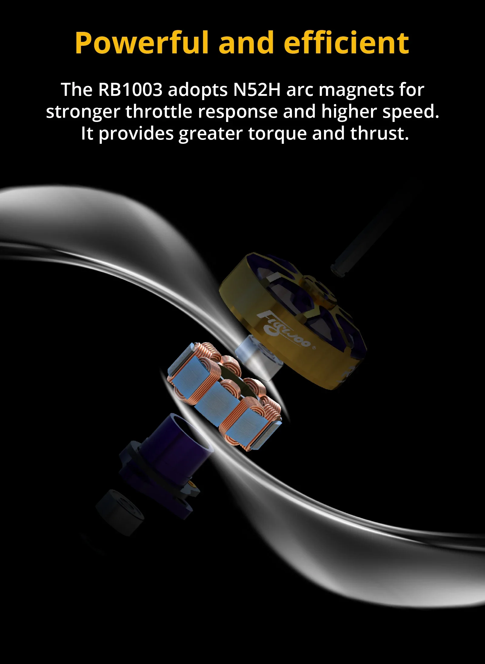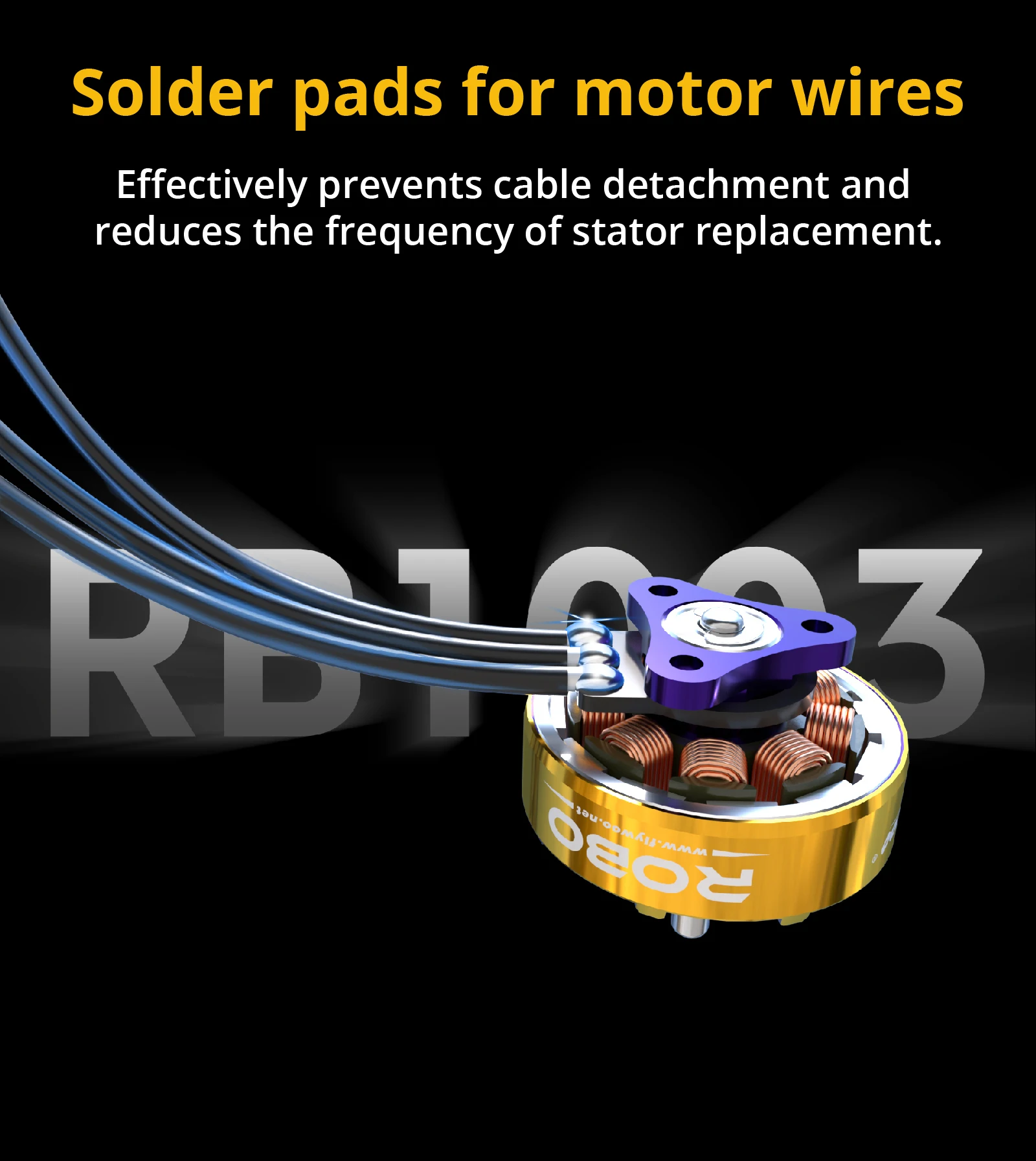 The FLYWOO RB1003 motor adopts a new structural design with a dual bearing design. This dual bearing design enables better control of shaft movement, reducing noise and vibration. It enhances stability and is more power-efficient. The motor is made of 7075 aviation aluminum material, features a high-efficiency magnetic circuit design, has a dual-color oxidation appearance, a wire soldering pad design, weighs only 3.3g, offers efficient power, smooth operation, and stable control. It is very suitable for whoop and toothpick models.