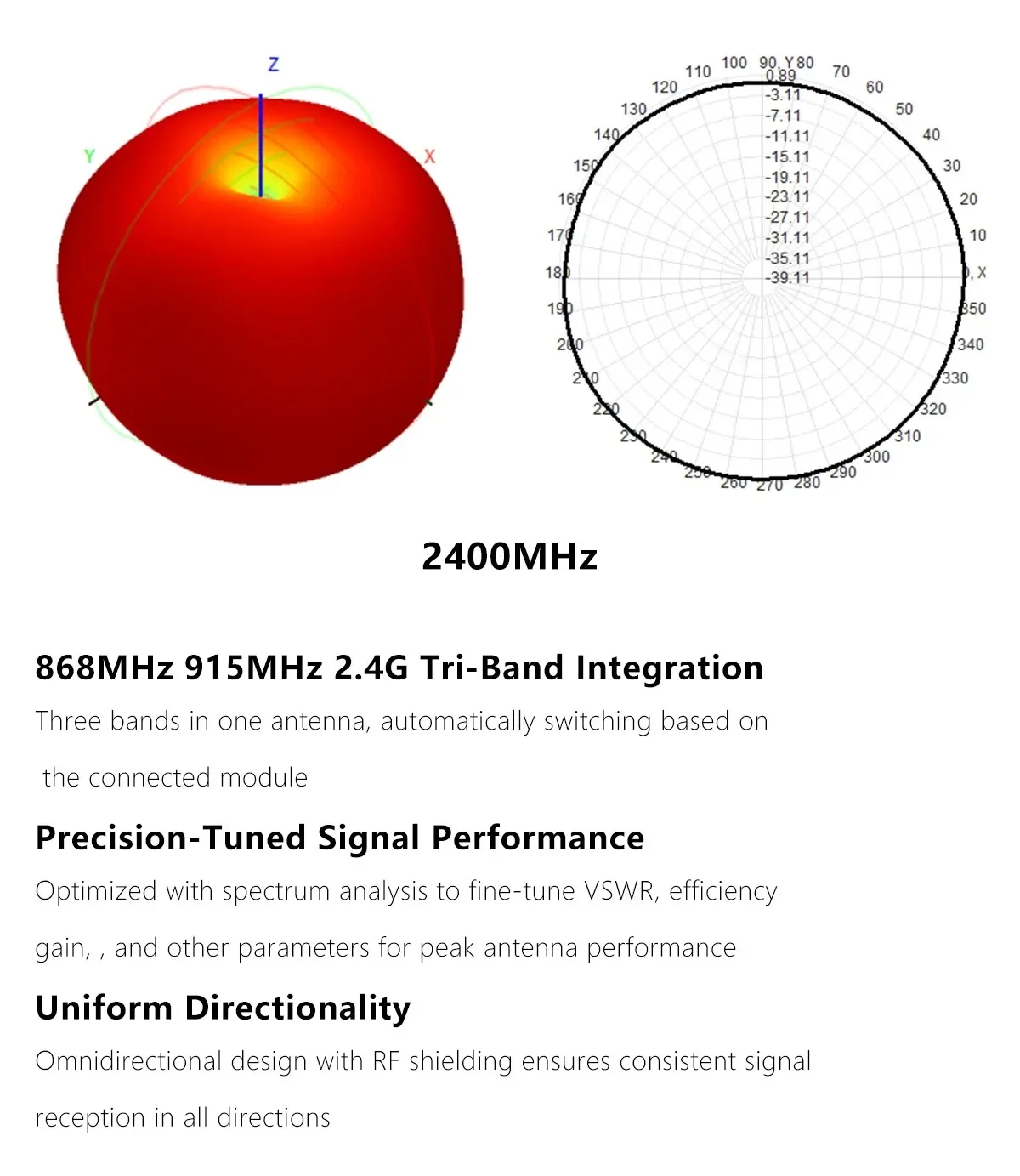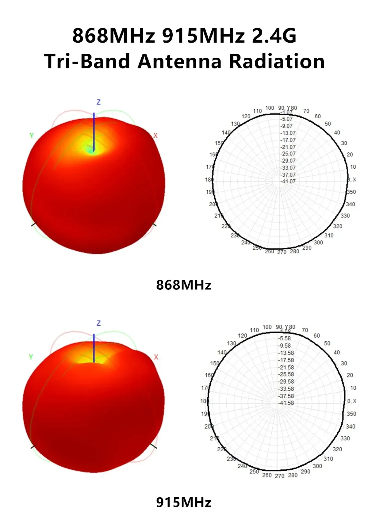 1.Triple-band design, 868MHz covers 860-870MHz, 915MHz covers 900-930MHz, 2.4Gz covers 2400-2500MHz