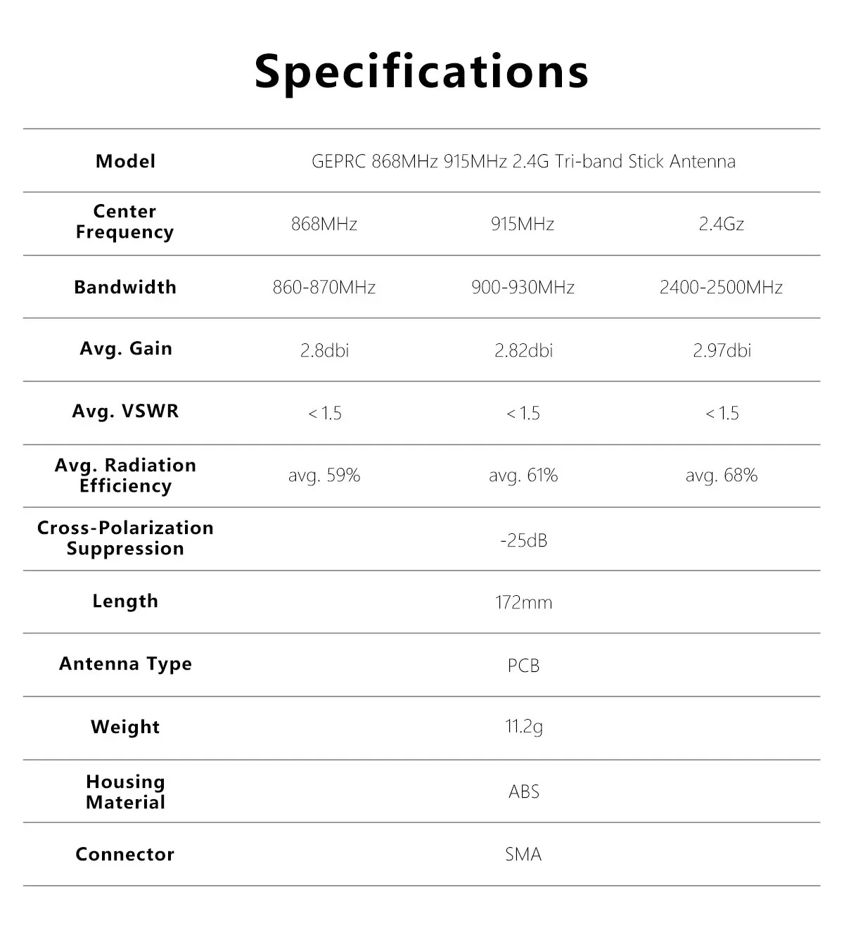 Model: GEPRC 868MHz / 915MHz / 2.4GHz Tri-Band Stick Antenna