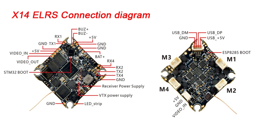X14 ELRS flight controller is the updated version for X12ELRS PRO, this flight controller is based on STM32G473 MCU, provide more UARTs, built-in 12A 4-IN-1 ESC and Serial ELRS receiver, also comes with OPENVTX max power up to 400mw. It’s a good option for 75mm/85mm 2S whoops building. FC · MCU: STM32G473CEU6 · Gyro: ICM42688P · Blackbox memory: 16MB · Sensor: Voltage & Current · BEC: 5V, Max. 2A · UART: UART 1, UART 2, UART 3 (For RX), UART 4(For VTX) · BetaFlight OSD: AT7456ELAH · ESC: 12A continuous · OPENVTX: 5.8GHz 48 channels, Max. 400mW · FC firmware target: CRAZYBEEG473 · USB port: SH1.0-4Pin · Battery connector: XT30 or A30 · Mounting hole size: 25.5mm x 25.5mm · Weight: 4.83g without power pigtail and VTX antenna ESC · Power input: 1-2S Lipo input · Current: 12A continuous, 15A peak · ESC firmware: V0.19 48KHz Bluejay · Firmware target: Z_H_30_48KHz · Digital signal protocol: DShot300, DShot600 VTX · OPENVTX Firmware · Support firmware upgrade by openvtx configurator · Output power: PIT/10/25/100/400 · Frequency: 5.8GHz 48 channels, with Raceband: 5658~5917MHz · Channel SEL: SmartAudio2.1 · Modulation type: FM · Operating temperature: -10℃~+80℃ · Antenna port: IPEX1/U.FL RECEIVER · Serial ExpressLRS 2.4GHz · Antenna: Enameled copper wire 31mm length · Firmware target: HappyModel EP1/EP2 2.4GHz RX · Telemetry output Power: <12dBm · Compatible with ExpressLRS V3.x.x TX Module · ExpressLRS firmware version 3.0.1 · Support flash firmware by WIFI · Bind method is the same like all ExpressLRS 2.4GHz receivers |