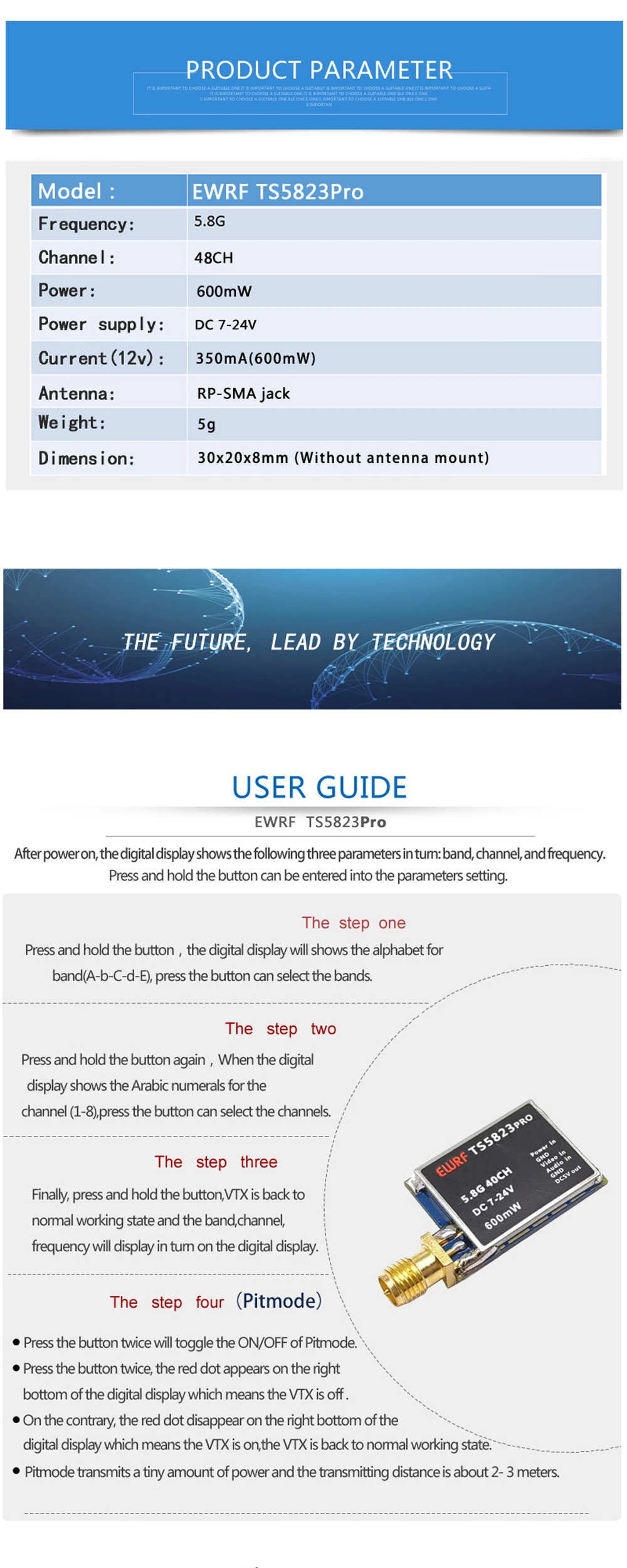 ● Built-in super sensitiveness 5.8GHz 40CH receiver, especially with RaceBand