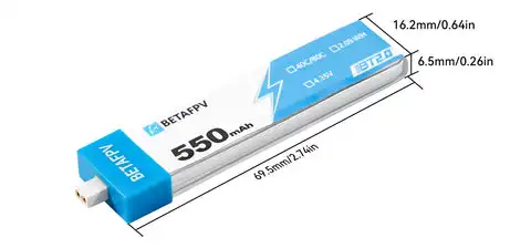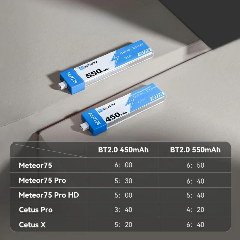 BETAFPV Meteor75, Meteor75 HD, Meteor75 Pro, Meteor75 Pro HD, Cetus Pro, and Cetus X are compatible with BT2.0 550mAh 1S battery, ensuring more time to create and less time worrying about the battery level. Pilots who fly 75-80mm whoop drones can also use BT2.0 550mAh battery.