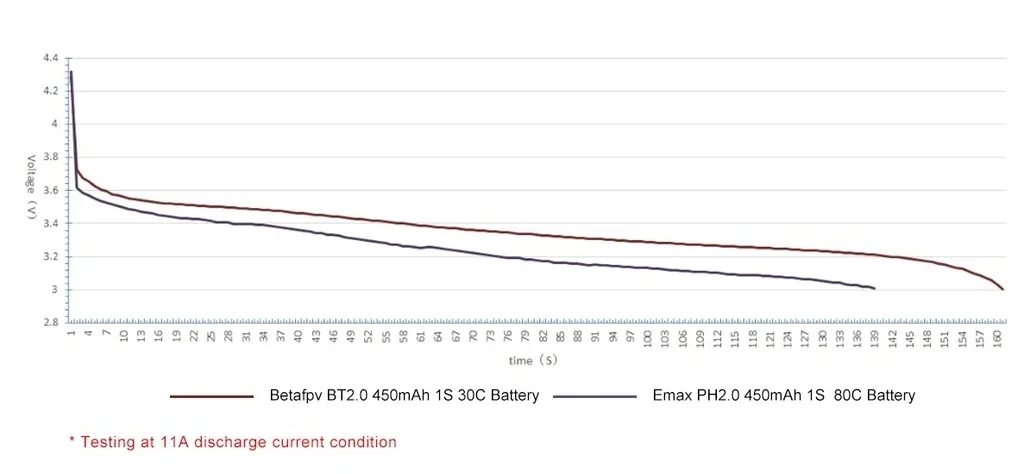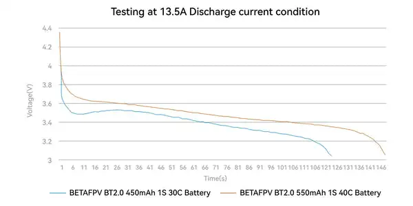 There is a graph of comparison between BT2.0 1S 550mAh battery and BT2.0 1S 450mAh battery. The discharge current is 13.5A in this testing. You could see that it has a longer time and improvement in voltage, which brings better flight performance.
