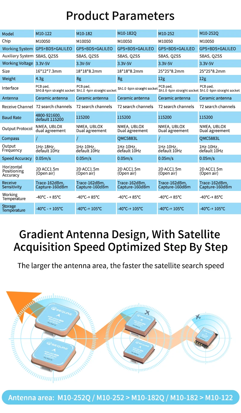 (1) SEQURE M10 second-generation GPS is designed with a 10th-generation chip optimization solution and GPS+BDS+GALILEO positioning system, supporting NMEA/UBLOX protocol. It has a faster positioning speed and stronger anti-interference.