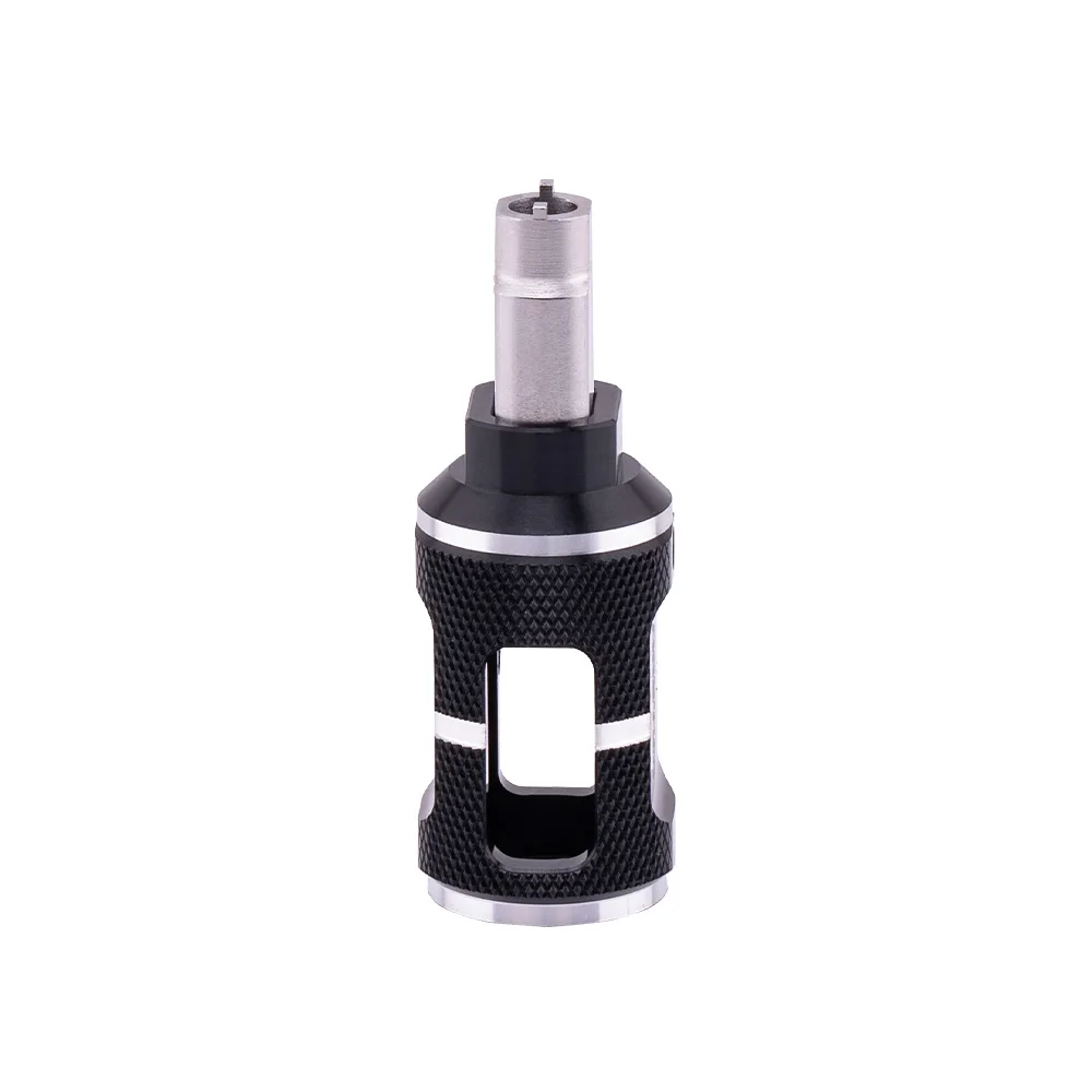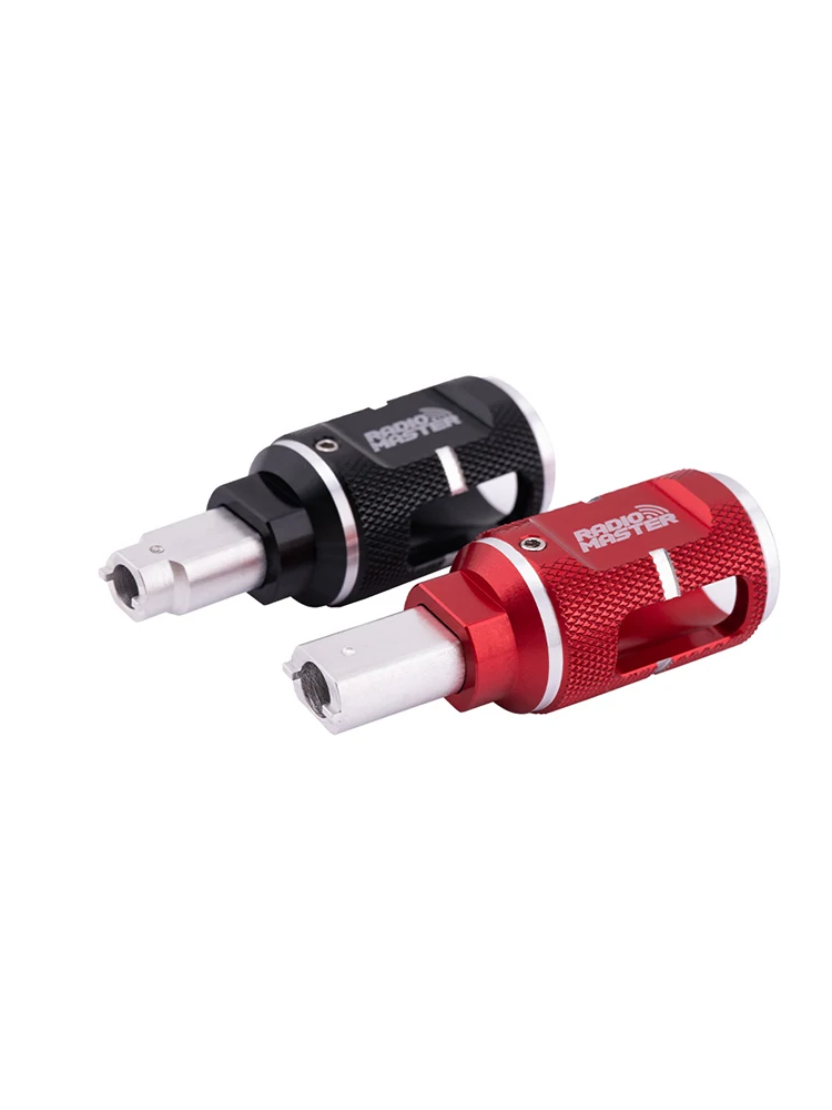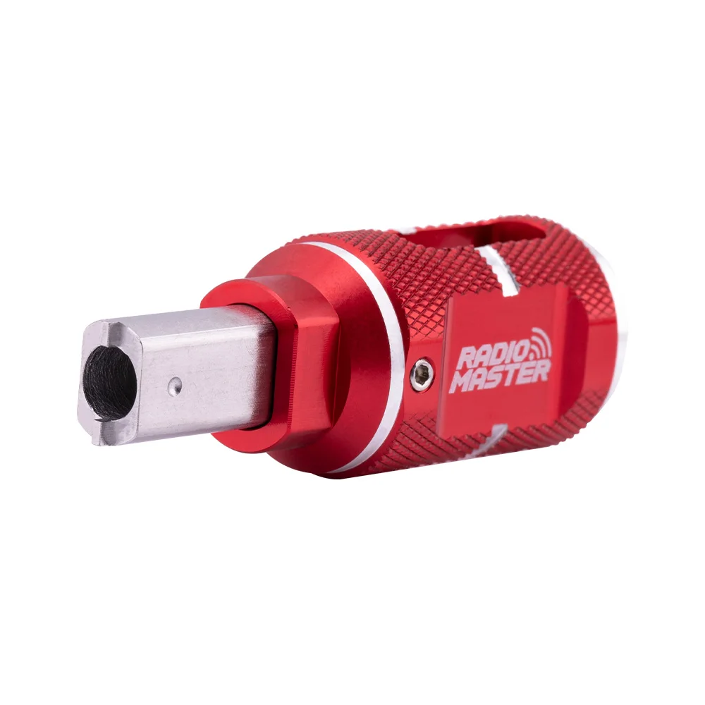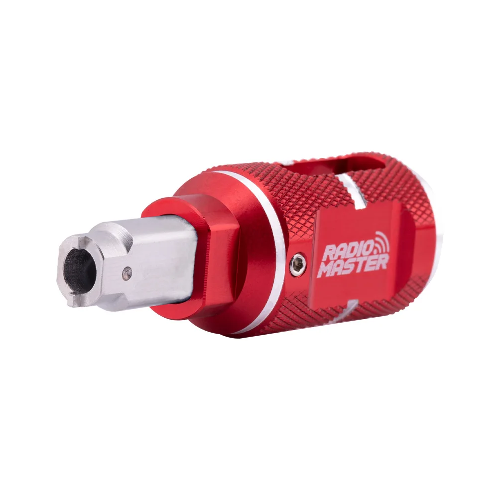 The RadioMaster Switch Nut Tool is a versatile and durable tool designed for effortlessly tightening or loosening switch collets on RC radios. It includes two sizes to accommodate various switch nut sizes across different radios. Simply loosen the two set screws to flip the tool within its anodized aluminum handle for seamless use. For a pro-level toolbox, keep one tool in each color, ensuring quick access to both sizes!