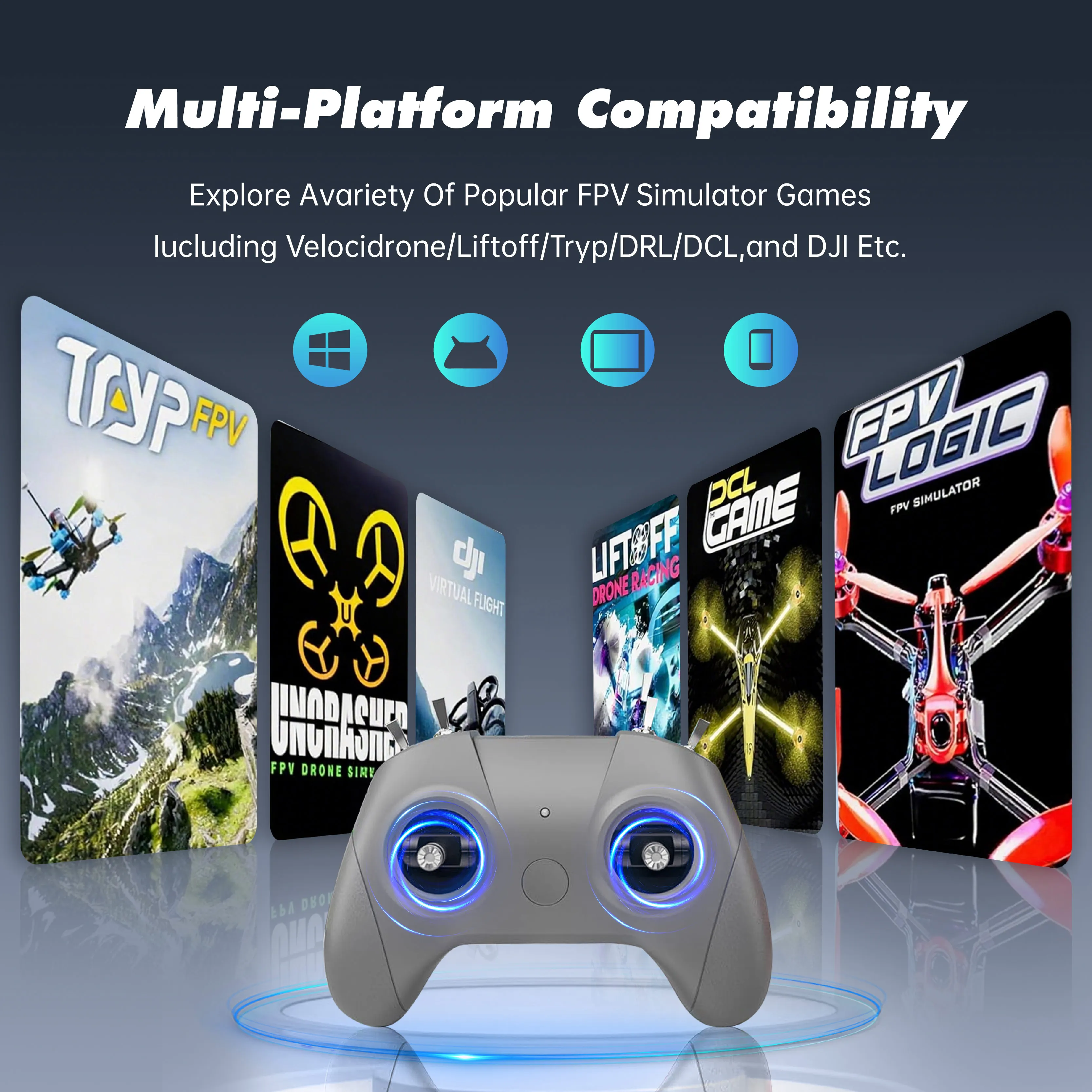 Full agreement software ecosystem support Liftoff, DRL, DCL, AI Drone Simulator, TRY P FPV, Uncrashed, Freerider, (Velocidrone), FPV LOGIC, SkyDive, FPV Worldwide FPV Battleground, Black Sheep (currently not supported on Phoenix Emulator, DJI, and AeroFly RC 10)