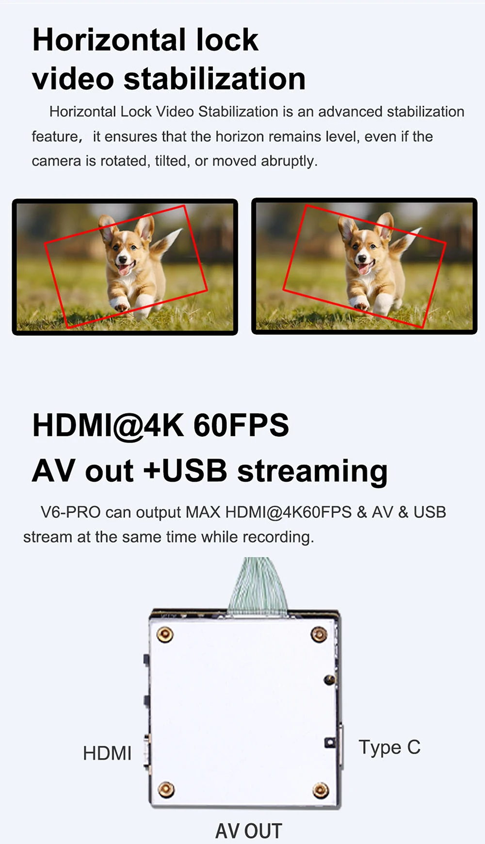 5. V6-PRO can output MAX HDMI@4K60FPS & AV & USBstream at the same time while recording.