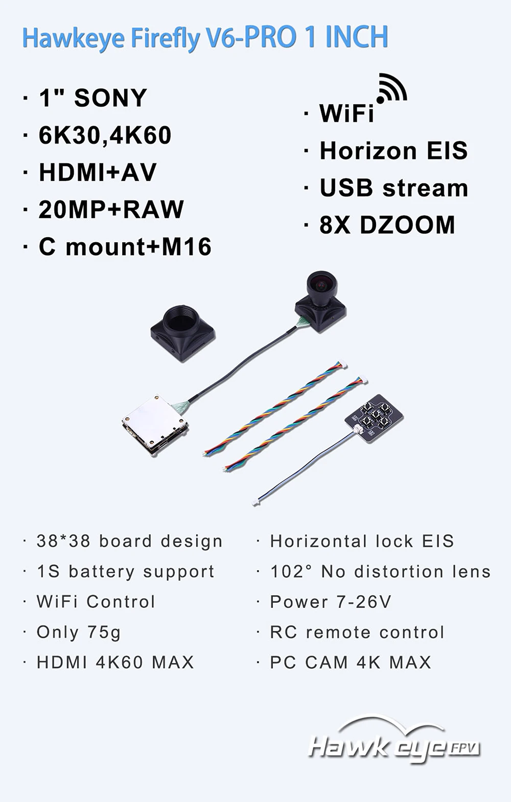 Hawkeye Sony 6K Card Recorder Camera V6 PRO 1 INCH 20MP Camera WiFi control DC 7-26V 8X Digital zoom Multiple C-mount Housings