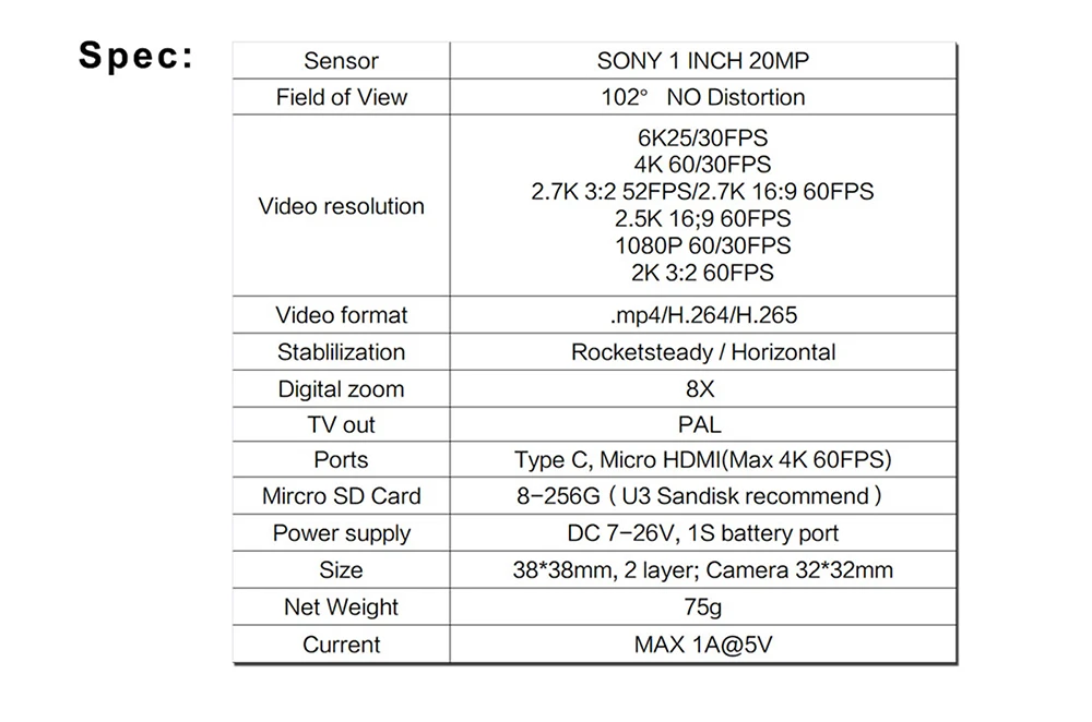 Mircro SD Card: 8-256G(U3 Sandisk recommend )